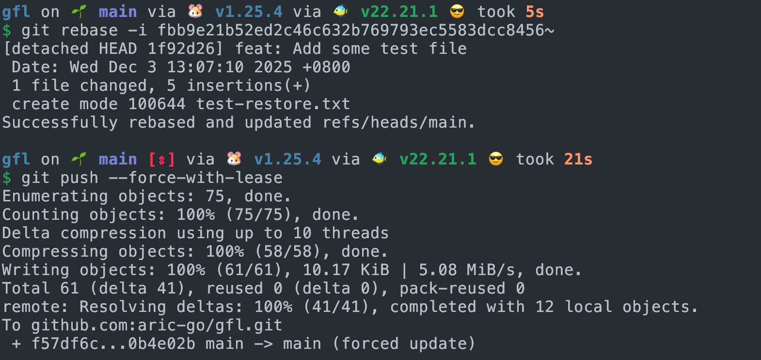 # Now the fixup commit has been squashed回滚到某个githash # reset + force push to origin